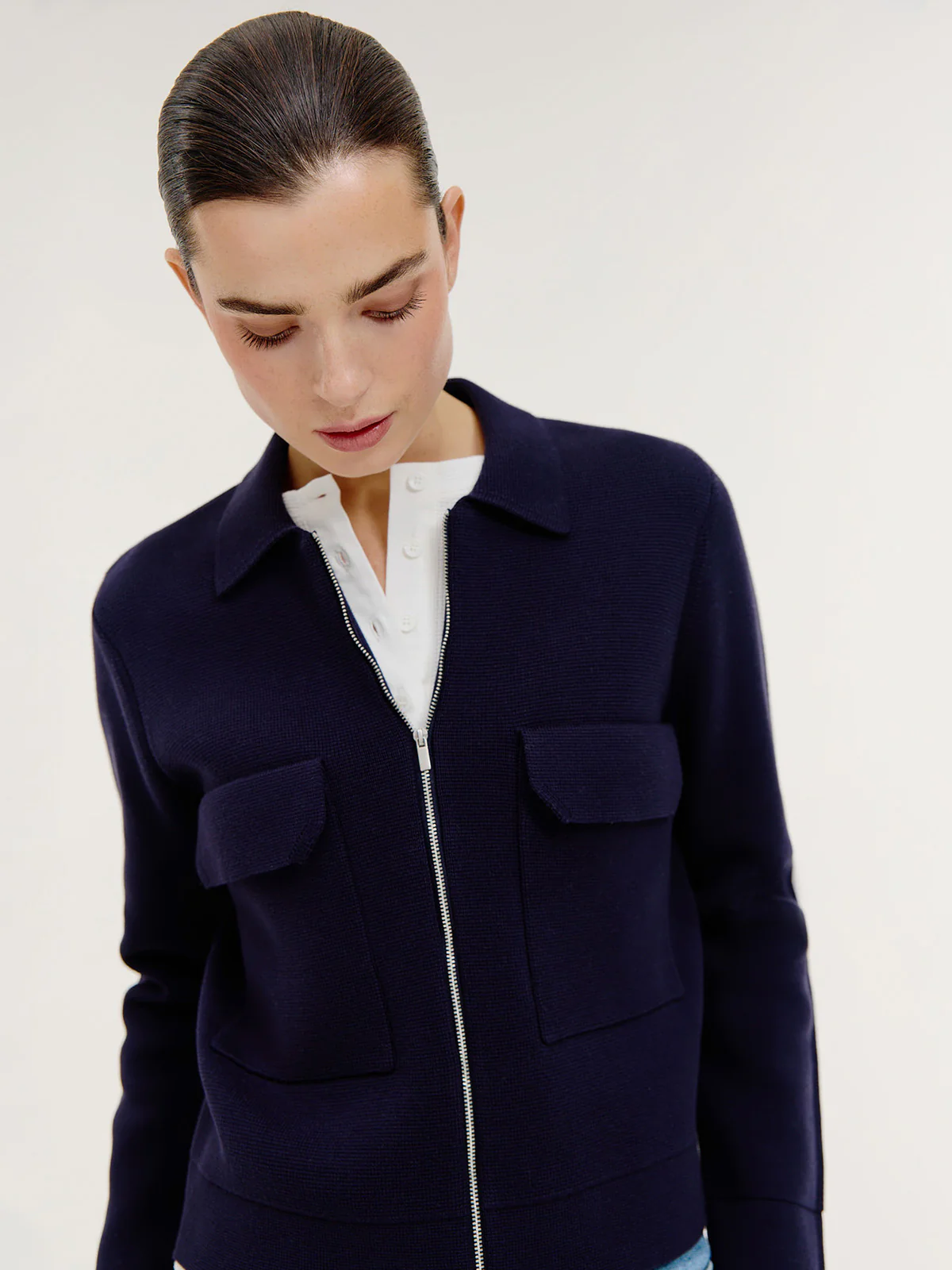 Finished with a classic collar and a matte silver two-way zipper for a subtle technical accent. The large patch chest pockets add character, while the long sleeves and clean hem enhance the modern lines.