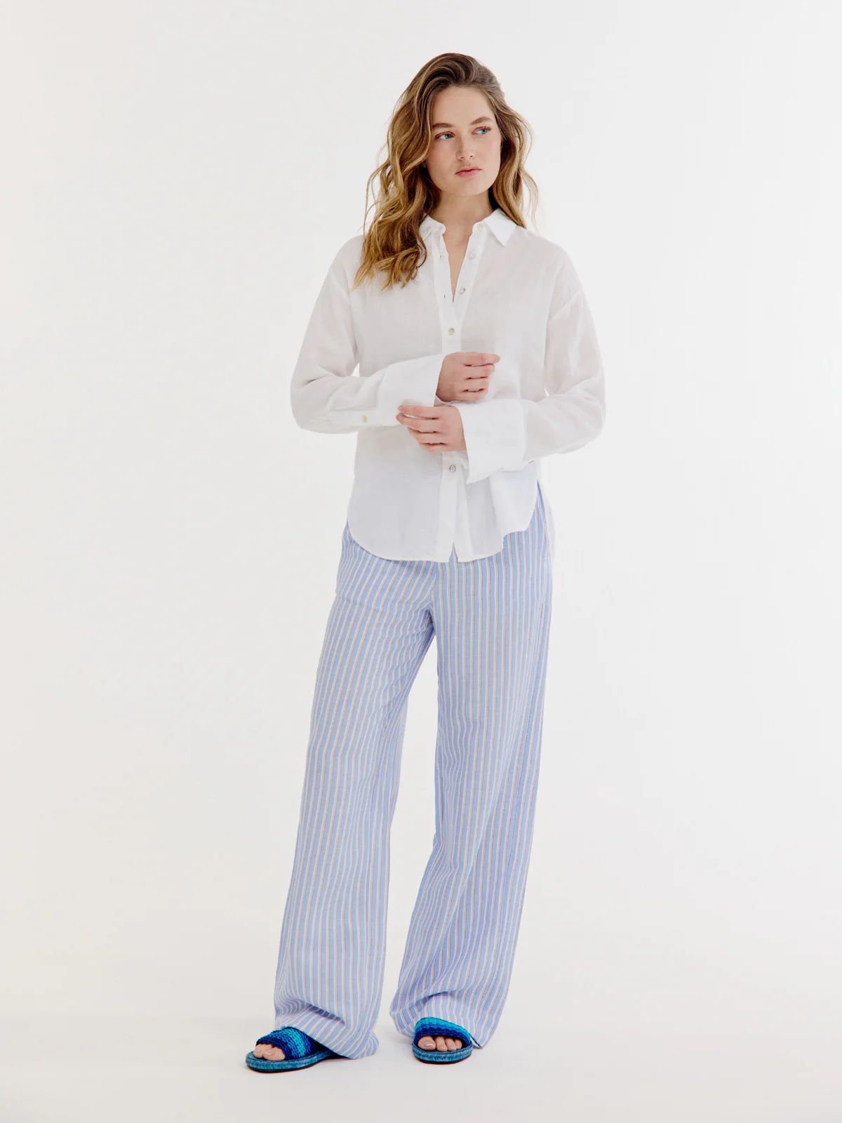 Finished with a classic blouse collar and a full button closure with genuine shell buttons for a subtle, summery luxury touch. The long sleeves with cuffs, slightly rounded hem and longer back panel enhance the relaxed drape. Wear it loose or half tucked in.