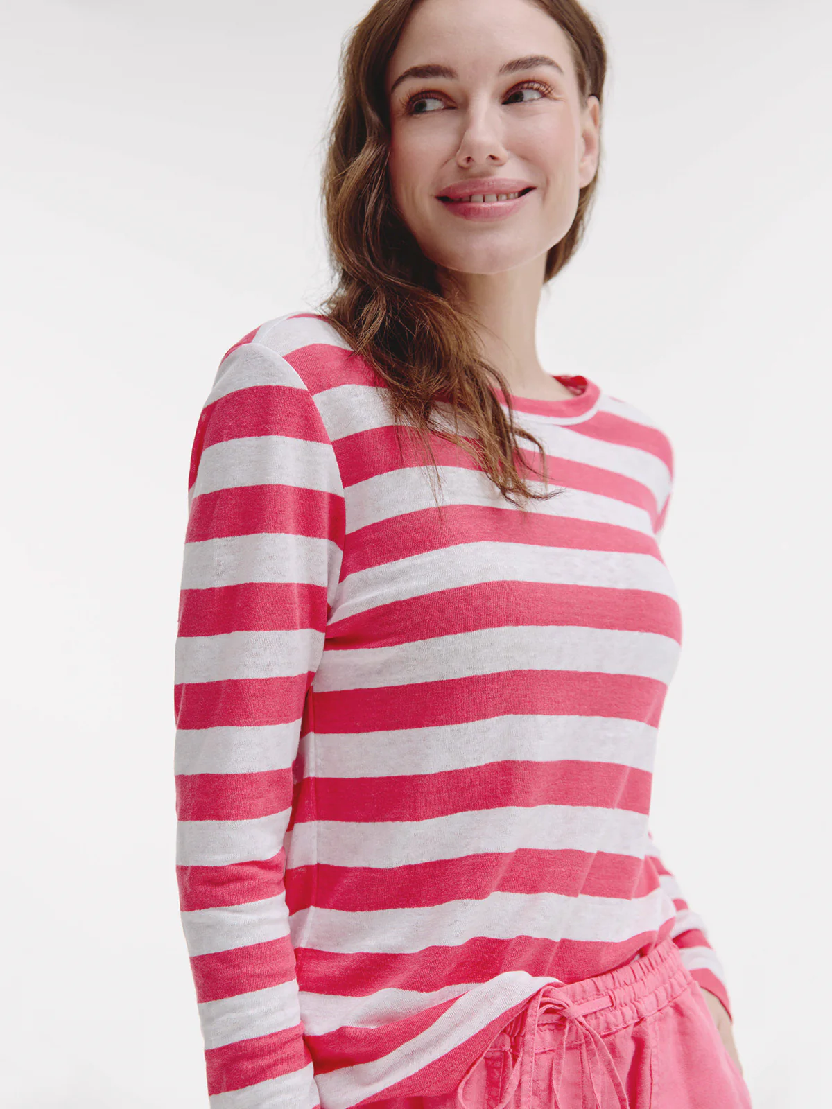 It features a straight, comfortable fit with long sleeves and a round neckline. The linen quality adds a slightly casual touch, perfect worn solo or layered.