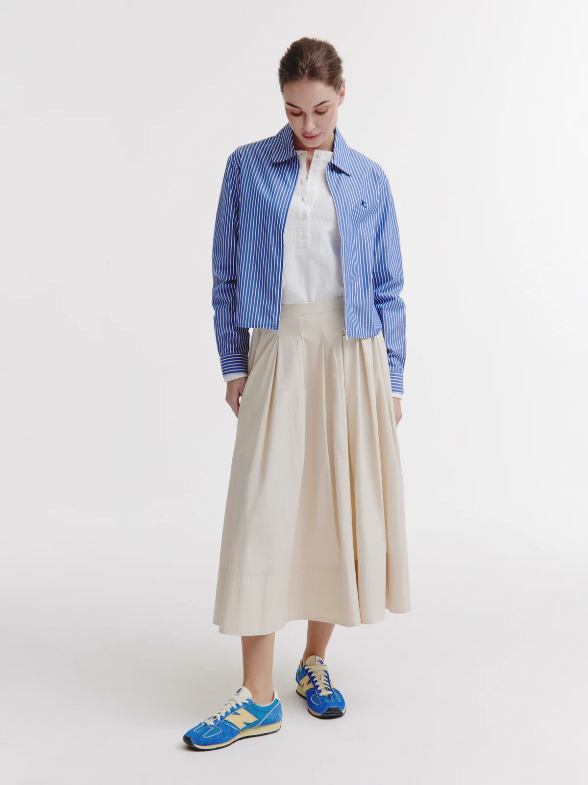 The Bodine Blouse is a contemporary cropped blouse with a clean, sporty look. The straight, boxy fit falls at the waist for a modern silhouette. The fine stripe pattern adds a timeless feel, while the matte silver zipper with puller at the front creates a refined, functional accent.